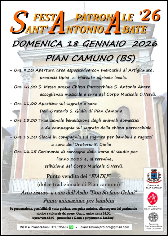 Domenica 18 gennaio 2026 il Comune di Pian Camuno festeggia il patrono Sant'Antonio Abate in collaborazione con Pro Loco Pian Camuno e Parrocchia Sant'Antonio Abate Pian Camuno.